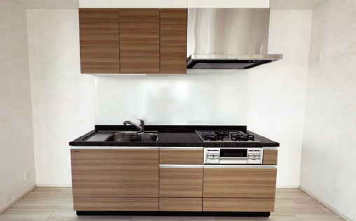 3口ガスコンロ・シングルレバー水栓・耐震ロック付吊戸棚を採用することで、コンパクト且つ機能的なキッチンを実現しています。