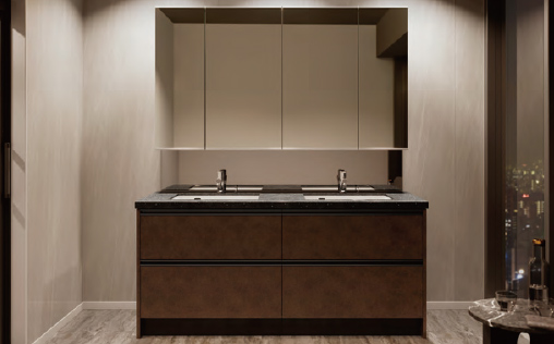 お部屋の全体的な色調とイメージを保ちつつ、、スタイリッシュで上質なデザインとなっています。シングルレバー水栓・ スライドキャビネット・収納付三面鏡等を採用することで、毎日の生活をより快適に過ごすことが出来ます。